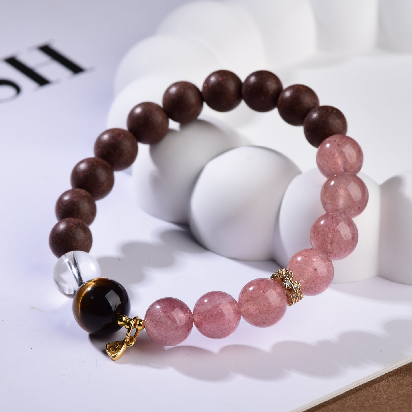 Triple Harmony Crystal Bracelet – Pink Quartz, Tiger’s Eye & Clear Crystal with Gold Charm